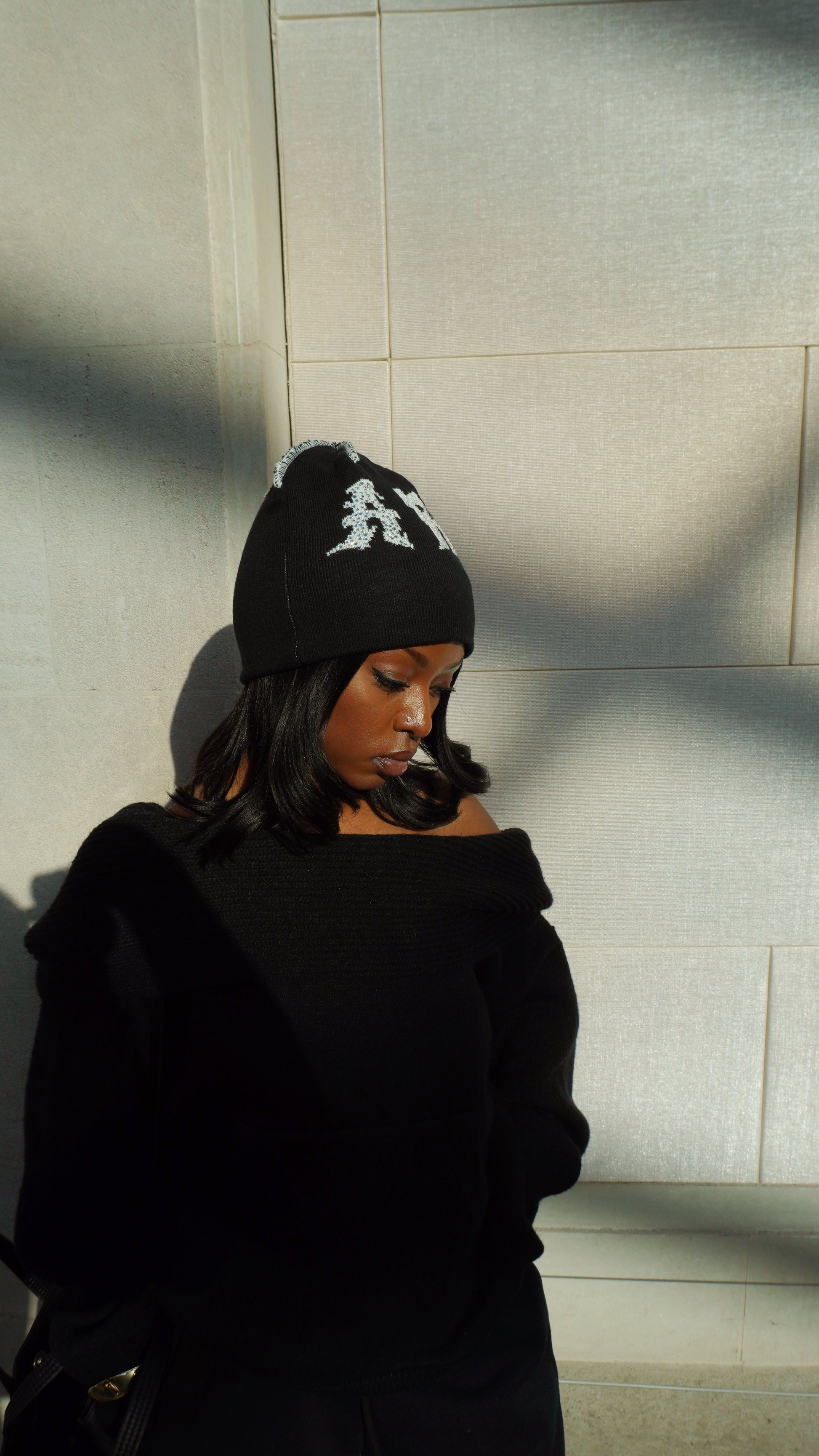 exposed seam gemstone ART beanie.